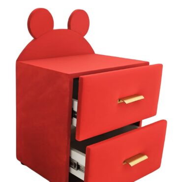 Noptieră pentru copii cu urechiușe, tapițată în catifea roșie, cu două sertare și mânere aurii.