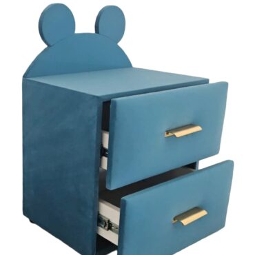 Noptieră pentru copii cu urechiușe, tapițată în catifea albastru deschis, cu două sertare și mânere aurii.