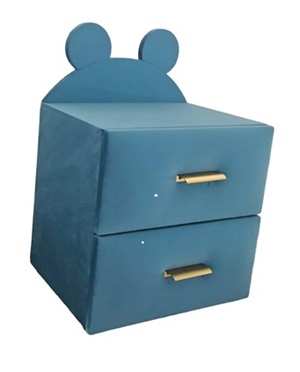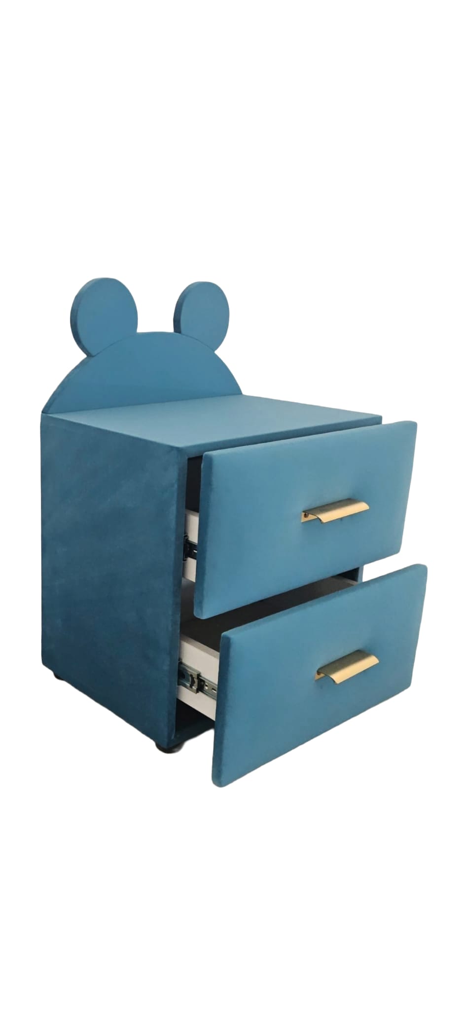 Noptieră pentru copii cu urechiușe, tapițată în catifea albastru deschis, cu două sertare și mânere aurii.