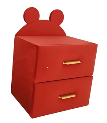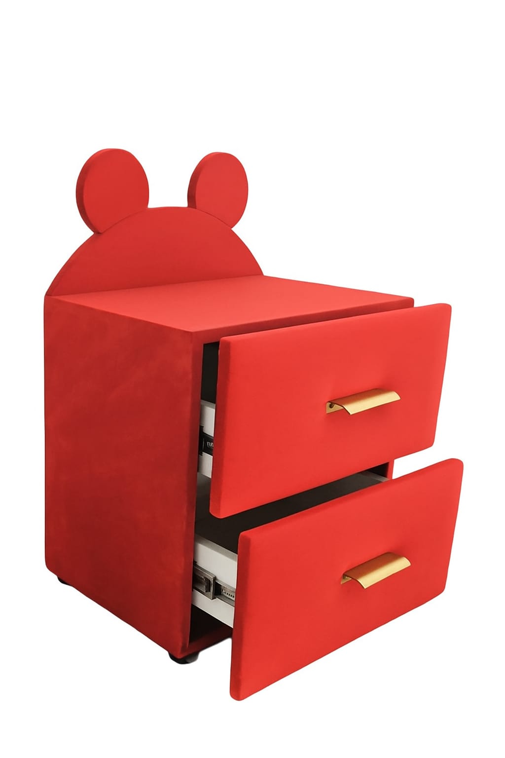 Noptieră pentru copii cu urechiușe, tapițată în catifea roșie, cu două sertare și mânere aurii.